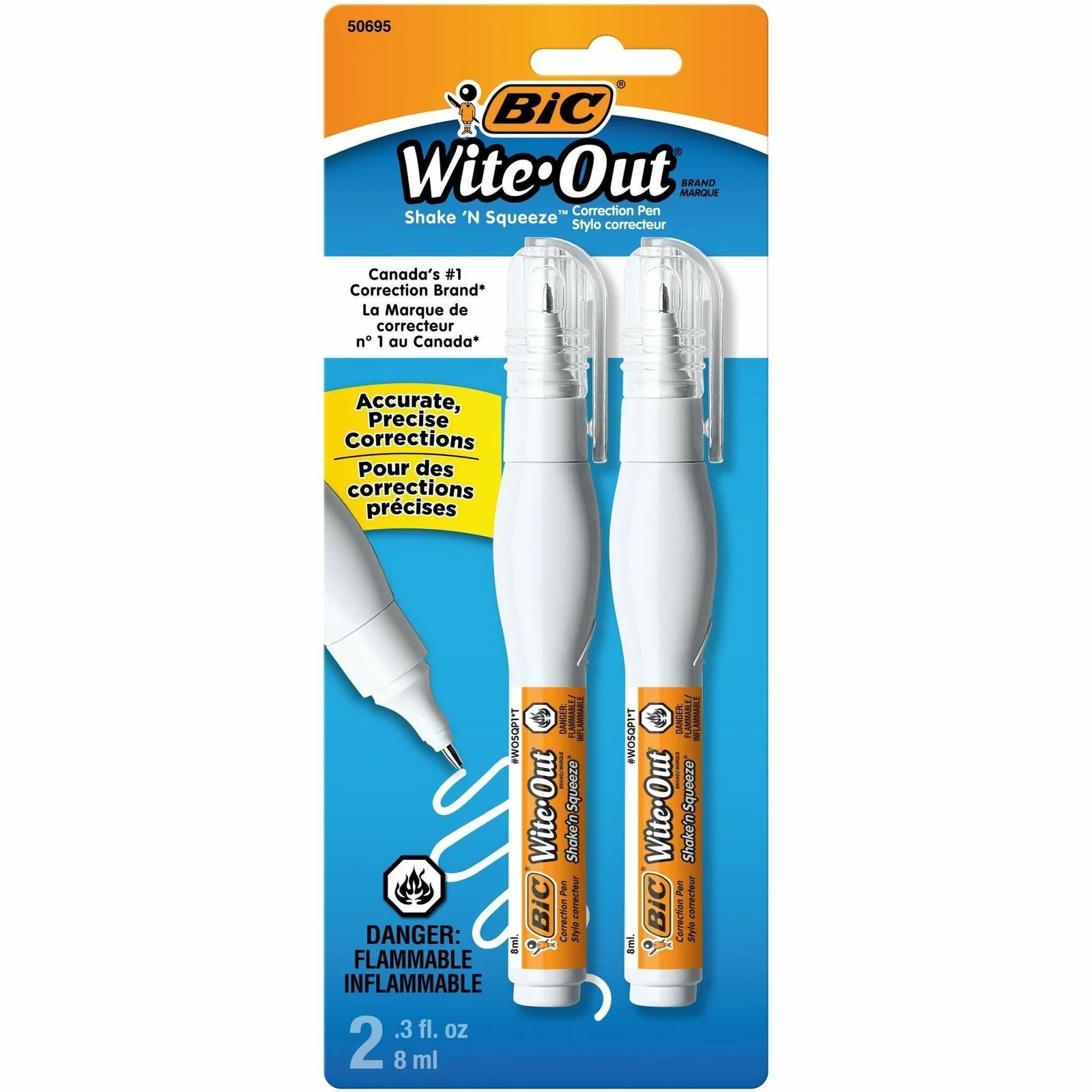 Bic White-Out Shake ‘n Squeeze. Soft, squeezable body enables user to correct with less effort and inceased control. Needle-point tip for increased precision, and neatness. Fast-drying, premium coverage, with smooth finish. 8mL per pen. Comes 2 per pack.