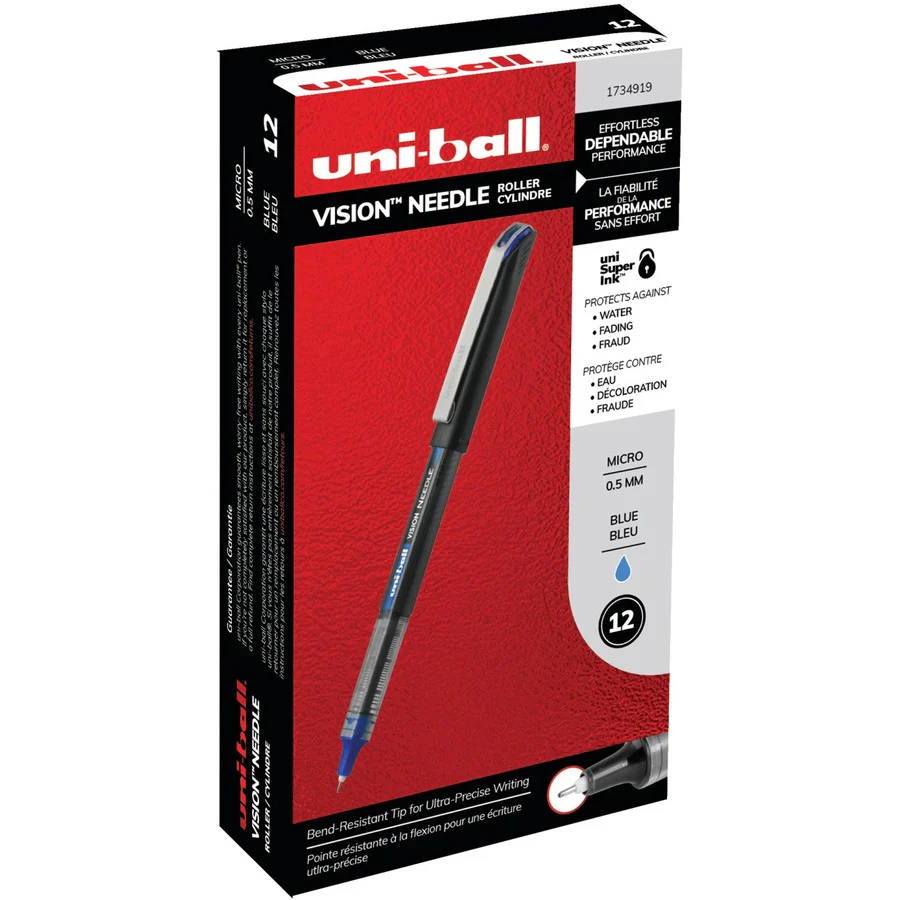 This pen offers the ultra-precision of the uni Vision Needle rollerball pen. The 0.5 mm ultra fine needle point uses uni-Super Ink to prevent cheque fraud and document alterations. The smooth grip enhances comfort, while the visible ink supply helps with monitoring ink levels.