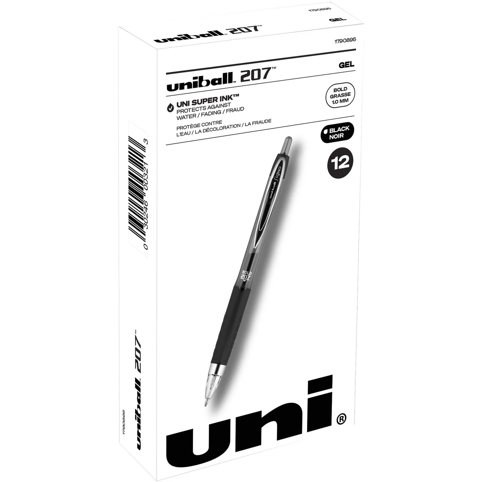 Stock your office, home or classroom with 207 Retractable Gel Pens. Stainless steel tip with a 1.0mm bold point resists bending and breaking. Even-flowing, pigment-based gel ink delivers a smooth writing experience for intense, vibrant lines, ensuring every mark is communicated. Bold point provides even ink laydown, creating pronounced letters, numbers and graphics. Use retractable pens for everyday writing tasks and important signatures, trusting quick-drying Super Ink. Innovative, uni Super Ink technology effectively entraps liquid ink into the paper, producing fraud-resistant, fade-resistant and water-resistant documents that prevent check washing and bleaching. Translucent window lets you see when your ink is low to avoid running out. Refill pen using uniball 207 Retractable Gel Pen Refills. Textured grip offers comfort and control. Sleek design with modern metal accents adds a stylish touch to your writing supplies.